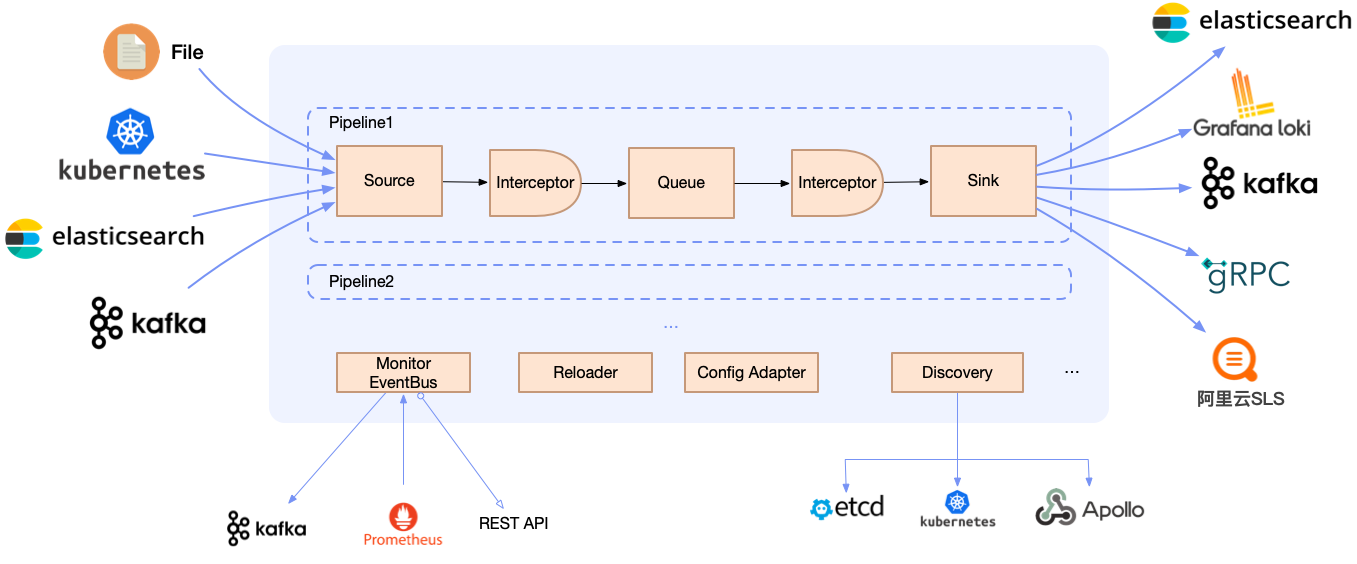 - Discovery:动态配置的下发,目前主要为Kubernetes下的日志配置,可以通过创建LogConfig等CRD实例的方式来采集容器日志。后续将陆续支持主机形态下的各种配置中心对接。